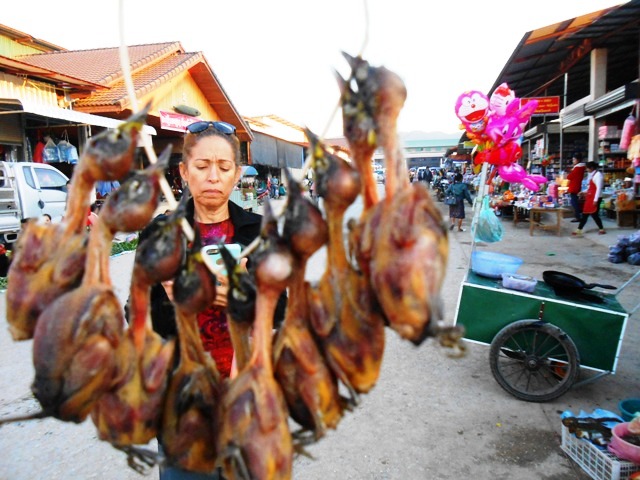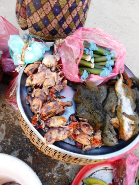 LLegamos en bus desde Luang Praban despues de 7/8 horas de viaje subiendo y bajando montanas con otros 9 turistas. Esa tarde nos acercamos al mercado que esta instalado cerca del hotel y vimos, por primera vez, productos comestibles de dificil digestion (pajaritos, ranas y hasta …. ardillas). Fue un poco shock pero sobrevivimos.