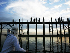 Hicieron falta 1.060 troncos para erigir el puente de madera más largo del mundo. Levantado hace 150 años con el fin de unir la pagoda de Kyauktawgyi y la aldea de Taungthaman con la ciudad de Amarapura, cercana a Mandalay, contemplarlo mientras se pone el sol es un espectáculo fantasmagórico. Las aguas del lago Taungthaman se vuelven azul marino, el cielo se engalana de rosa y el sol pasa de amarillo naranja a rojo reventón, haciendo de los monjes que lo cruzan, la gente en bicicleta y las mujeres con canastos en la cabeza sombras chinescas que representan un papel tan real como esa vida que les lleva a cruzar el puente cads día mientras los turistas, apostados en las barcas, les contemplan atónitos.