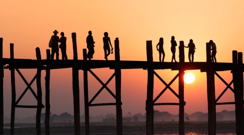 Hicieron falta 1.060 troncos para erigir el puente de madera más largo del mundo. Levantado hace 150 años con el fin de unir la pagoda de Kyauktawgyi y la aldea de Taungthaman con la ciudad de Amarapura, cercana a Mandalay, contemplarlo mientras se pone el sol es un espectáculo fantasmagórico. Las aguas del lago Taungthaman se vuelven azul marino, el cielo se engalana de rosa y el sol pasa de amarillo naranja a rojo reventón, haciendo de los monjes que lo cruzan, la gente en bicicleta y las mujeres con canastos en la cabeza sombras chinescas que representan un papel tan real como esa vida que les lleva a cruzar el puente cads día mientras los turistas, apostados en las barcas, les contemplan atónitos.
