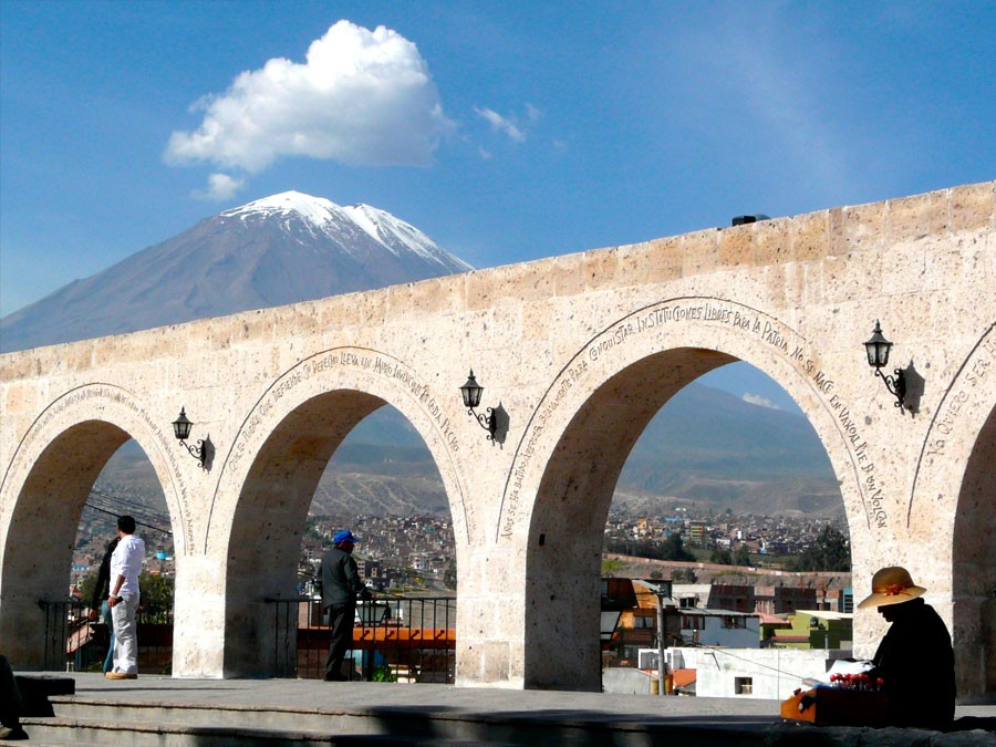 Situada en la falda de un volcán activo, el Misti (5.800 mts.) y cerca de otros dos el Chachani y el Pichi Pichu, Arequipa tiene en su historia más de catorce destrucciones debidas a la furia de estos Apus protectores. Quizás lo que no les gusta a los Apus es que esta ‘ciudad blanca’ lo sea por el color de la piedra sillar con que se construyeron la mayoría de sus bellos edificios coloniales, y porque ‘blanca’ es la población, ya que los colonizadores se encargaron de no mezclarse con la población indígena.