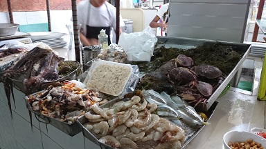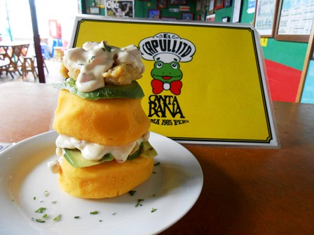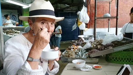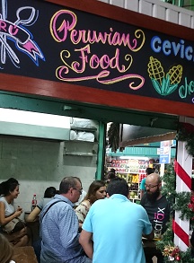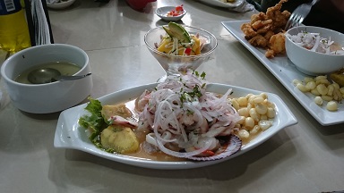 Gracias a Martha conozco mucho de la gastronomía peruana, así que sin dudarlo me lanzo a tomar mi primer almuerzo en uno de los mercado de Lima, Sauquillo. Es un pequeño mercado pero con una zona de comedor que este sábado está a tope de gente. No lo he dudado, un ceviche de pescado y una porción de causa limeña …